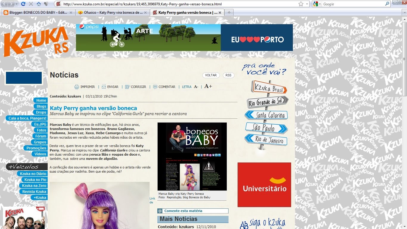Também mencionaram minha Katy Perry doll os sites Fofoki, o Somewhere In World, o BUZZ, o Vooz, Bem Paraná, o Net Mulher, A Vaidosa, o TV Ibope News, Zubaloo, o N°1, o G-SAT e o Jornal de Floripa, além de um monte de outros blogs de fãs da cantora!Bombou geral, valeu galera!!