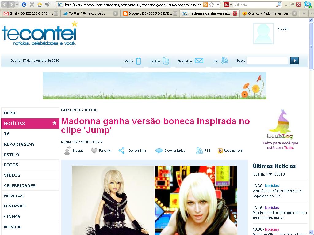Minha boneca "Madonna Jump" também foi destaque nos sites Yahoo OMG, Fofocando, Fofoki, o 6R, o Jornal da Cidade, Net Mulher, o G-SAT NET (de Portugal), Estilo Madonna, o Jornal Tribuna do Norte e mais um monte de sites e blogs dedicado a musa Madonna! Mais uma vez gente, valeu tanto carinho e divulgação da minha arte! Muito obrigado!!