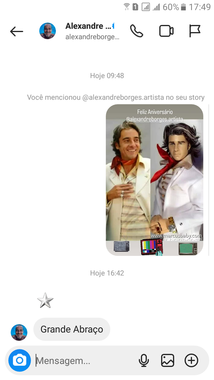 Chegou o dia: o ator Alexandre Borges comentou hoje, 23 de fevereiro de 2024 (seu aniversário), sobre o boneco que criei em 2010 em sua homenagem com o visual do seu personagem "Jacques Leclair" na novela "Ti-Ti-Ti" (TV Globo - 2010/2011) em meu Stories do Instagram!
